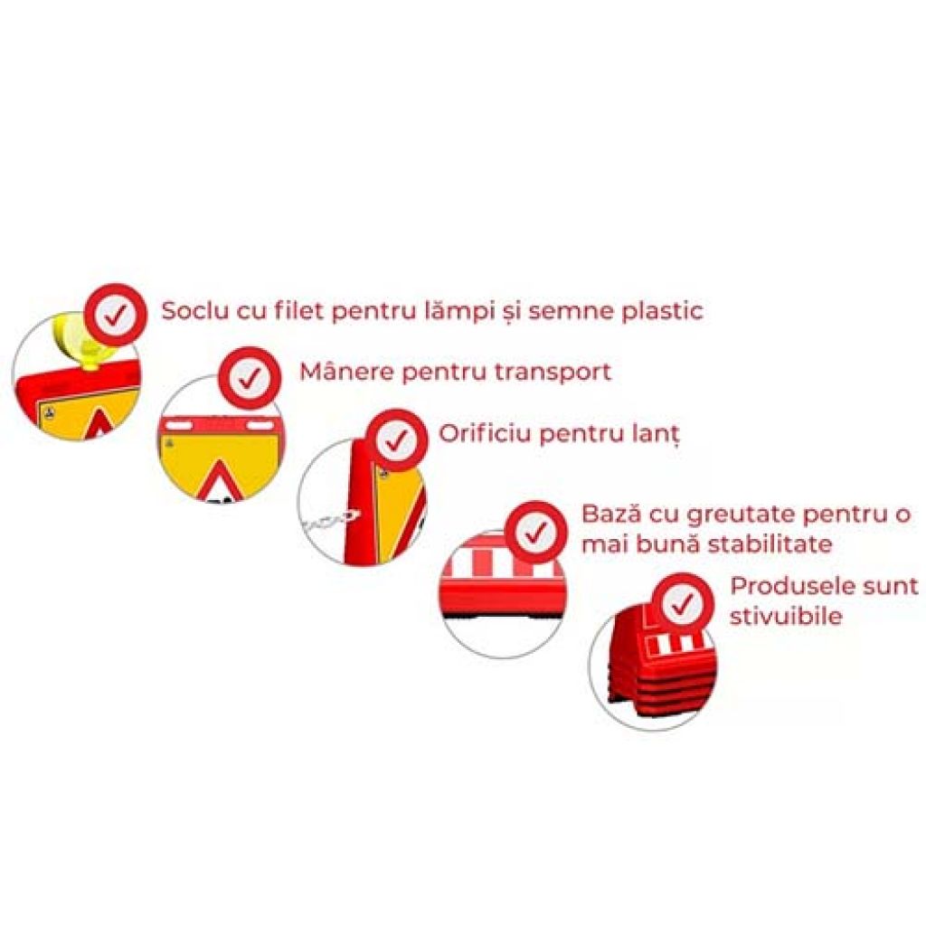 Baliza dispune de soclu cu filet pentru indicatoare rutiere din plastic, lămpi sau alte produse.