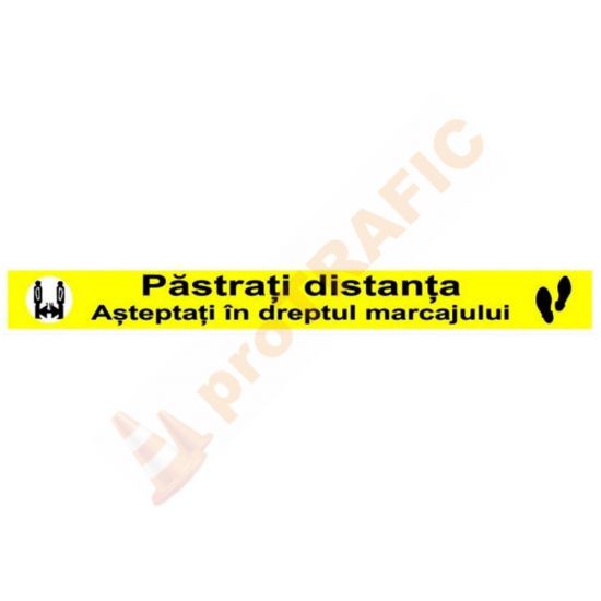 Banda autocolanta semnalizare distantare galben Pastrati distanta Asteptati in dreptul marcajului