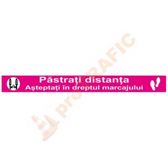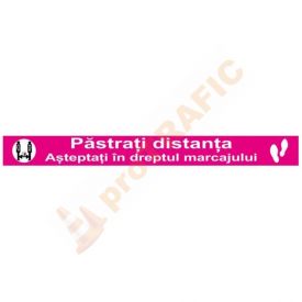 Banda autocolanta semnalizare distantare roz Pastrati distanta Asteptati in dreptul marcajului