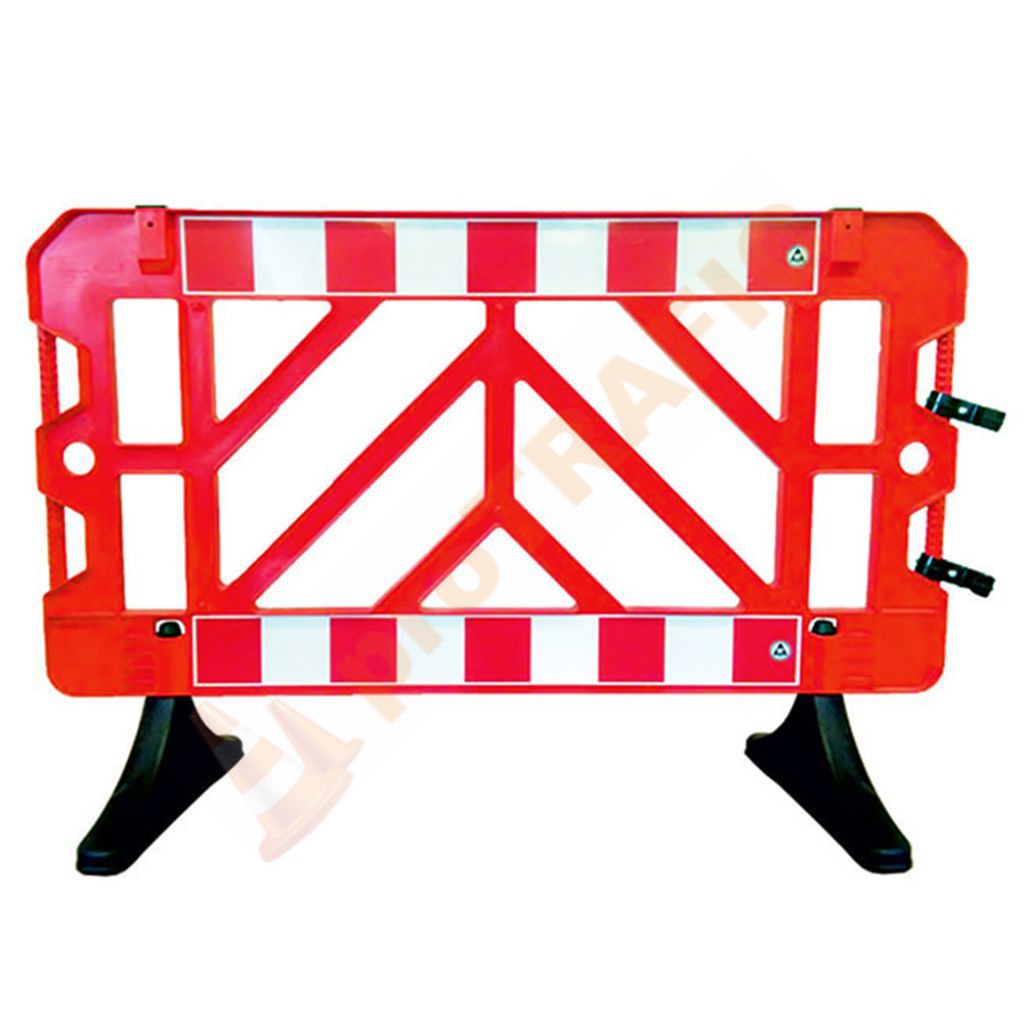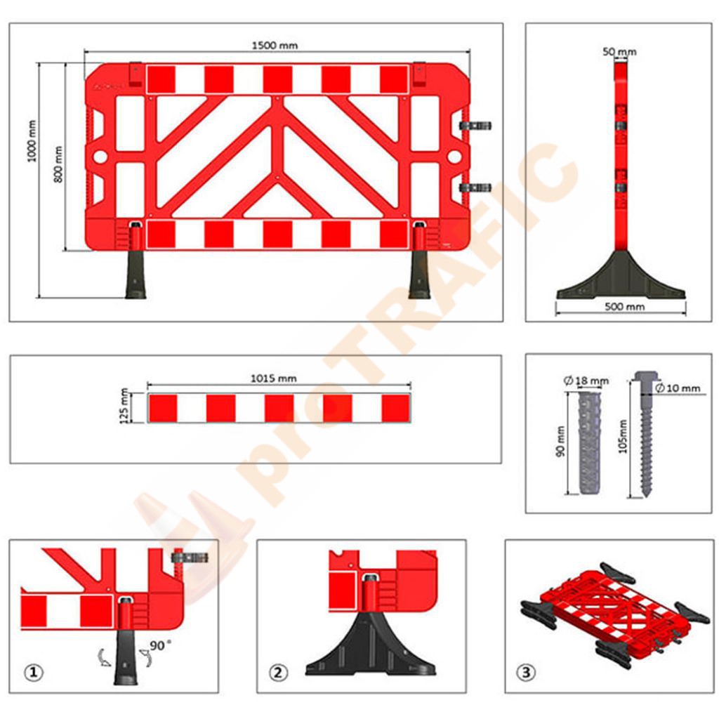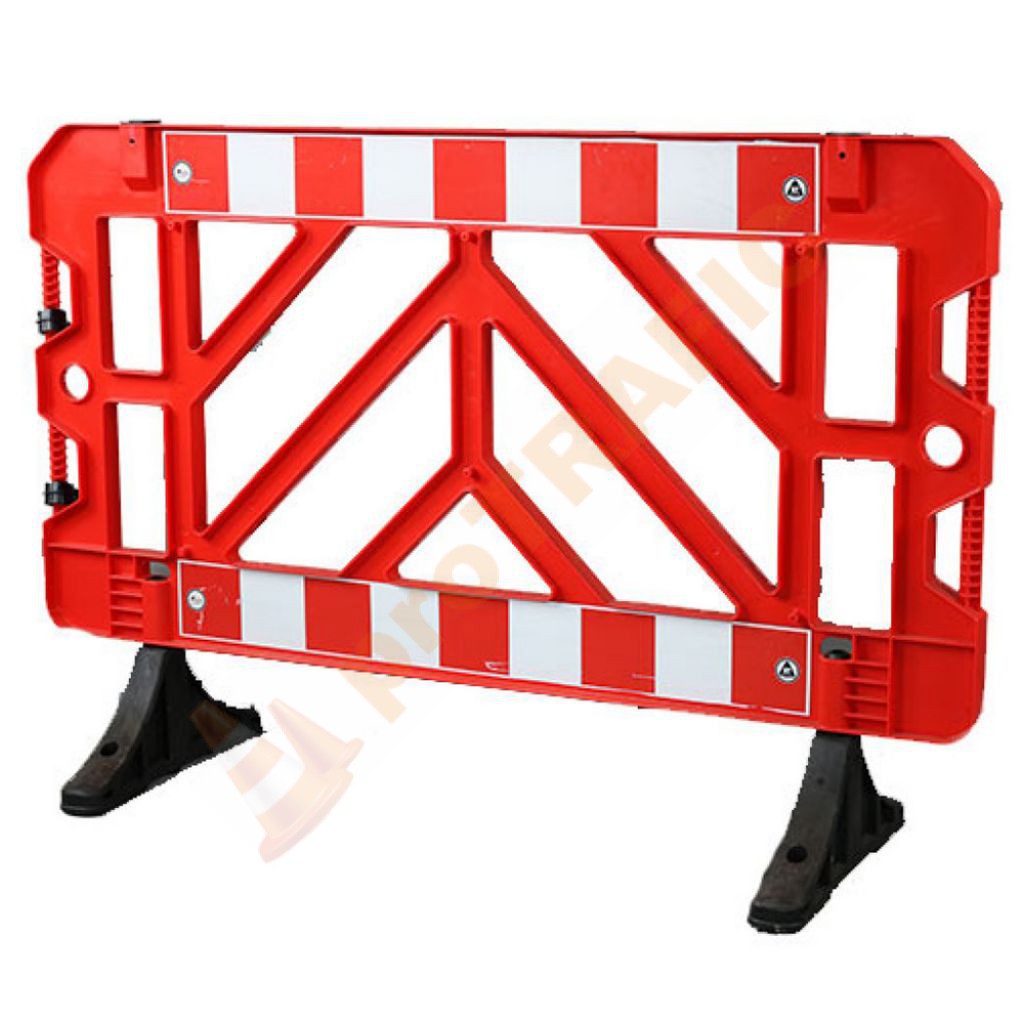 Bariera modulara pentru semnalizare lucrari 1500x1000 mm, rosie are o rezistentă sporită la soare sau ploaie, este ușor de transportat și îmbinat. Materialul din care sunt realizate, usurintă și practicitatea cu care sunt transportate și ridicate micsorează riscurile personalului și costurile.
