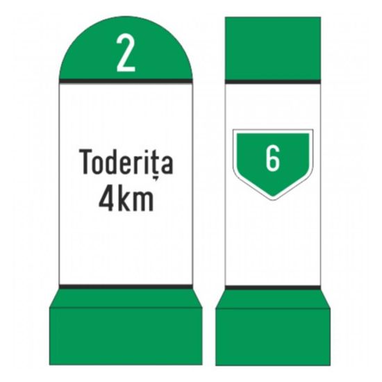 Borna kilometrica plastic drum vicinal folie clasa 1 executat din material plastic colorat în masă materialului în verde. Pe suportul de plastic se aplică folie reflectorizantă, produsă de 3M-SUA, inscripționată conform cererii beneficiarului.