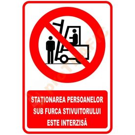 Indicator de securitate de interzicere 'Stationarea persoanelor sub furca stivuitorului este interzisa'