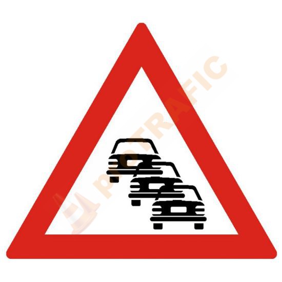 Indicator rutier avertizare A13 Drum aglomerat. La întâlnirea acestui indicator, conducătorul auto este obligat să pastreza o distanță de siguranță față de vehiculul care se deplasează în față să. Se amplasează pe drumurile publice pe care traficul este intens.