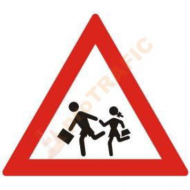 Indicator rutier avertizare A23 Copii  apare pe sectoarele de drum frecvent circulate de copii (aflate în imediata apropiere a grădiniţelor, şcolilor şi a locurilor de joacă). Conducătorul este obligat să reducă viteza sub 30 km/h în intervalul 7-22 şi să circule cu atenţie sporită.