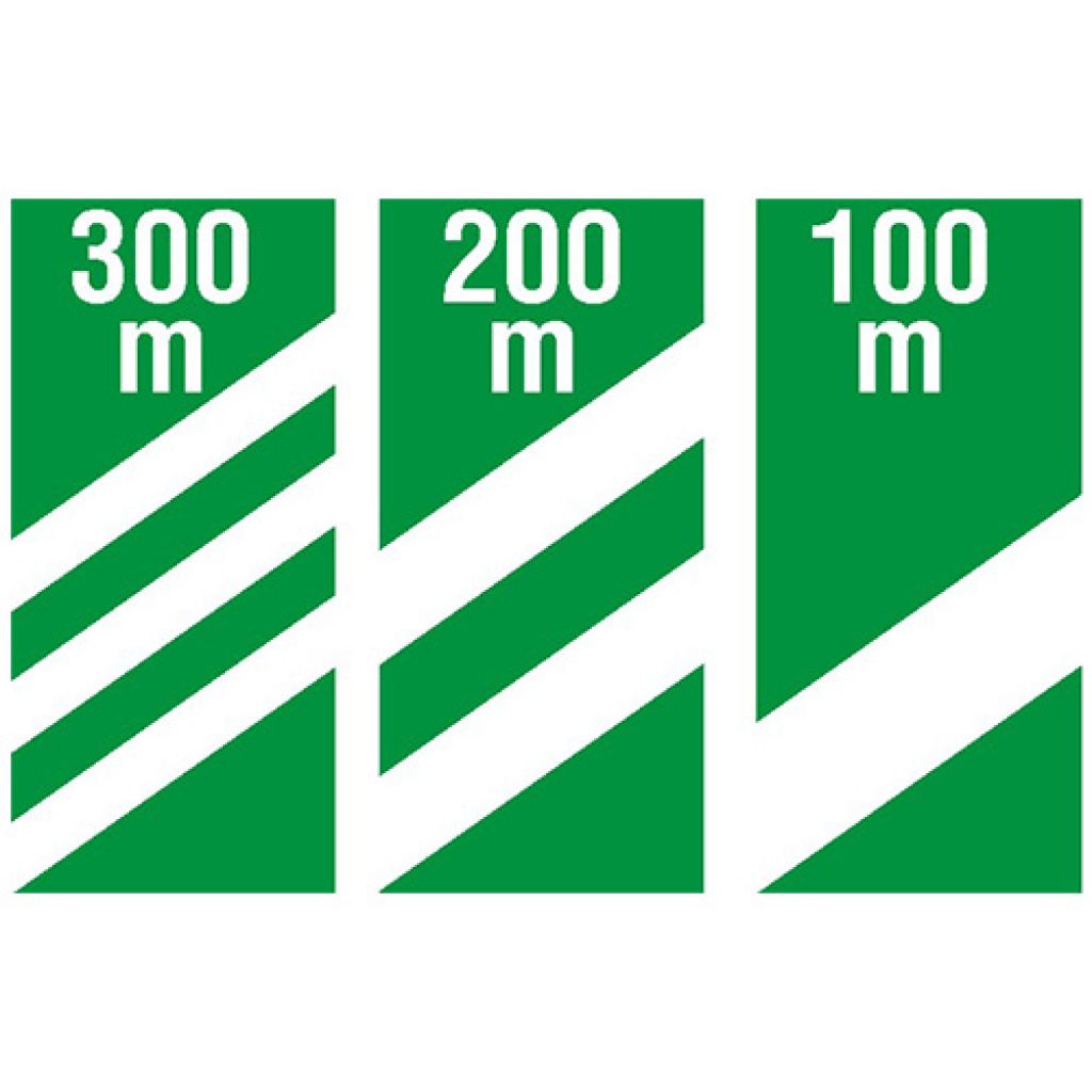 Indicator rutier avertizare A43 Panouri suplimentare la nodurile rutiere de pe autostrazi se monteaza la 300 m (primul panou), 200 m (al doilea panou) şi la 100 m (al treilea panou) de urmatoare bifurcaţie de pe o autostradă.