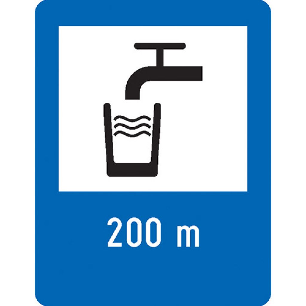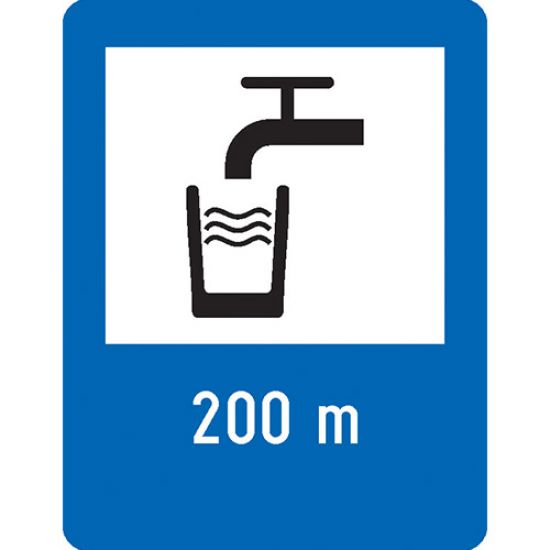 Acest indicator are forma dreptunghiulara, cu un fundal albastru si simboluri albe. Pictograma utilizata reprezinta de obicei un robinet sau o fantana, simboluri asociate cu sursele de apa potabila. Este amplasat in zonele unde exista astfel de surse, avand rolul de a informa si a facilita accesul la apa potabila pentru cei aflati in tranzit.