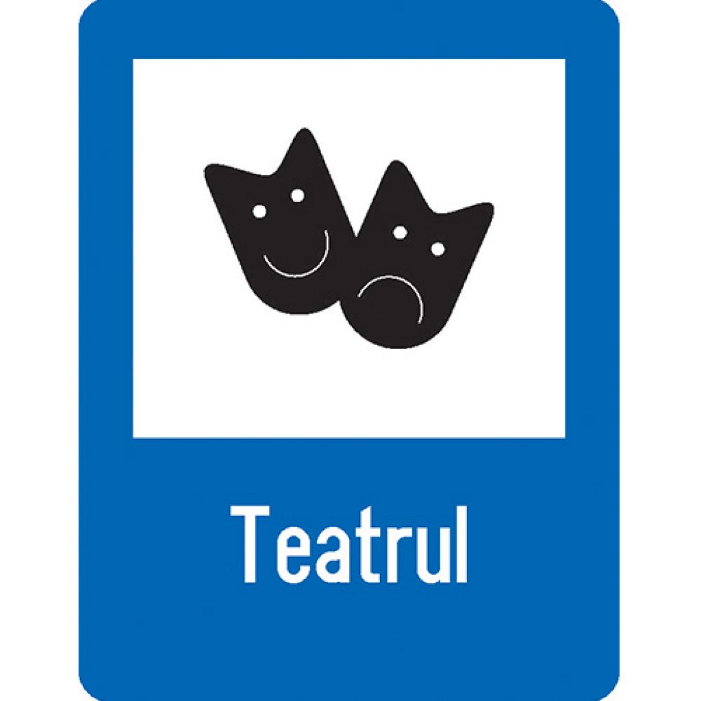 Acest indicator are forma dreptunghiulara, cu un fundal albastru si simboluri albe. Pictograma utilizata reprezinta de obicei o masca de teatru sau un simbol asociat cu arta teatrala. Indicatorul este amplasat pe drumurile care duc spre teatre, avand rolul de a ghida si informa participantii la trafic despre locatie.
