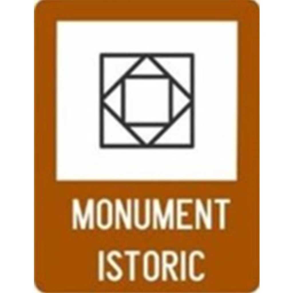 Indicator rutier de informare turistică T12 Monument Istoric semnalizeaza si directioneaza spre un obiectiv declarat monument istoric. Are forma dreptunghiulara, fundal maro si text/simboluri albe. Include un simbol specific monumentelor istorice, precum o cladire stilizata, si textul "Monument Istoric". Este amplasat pentru a ghida turistii catre obiective culturale sau istorice.