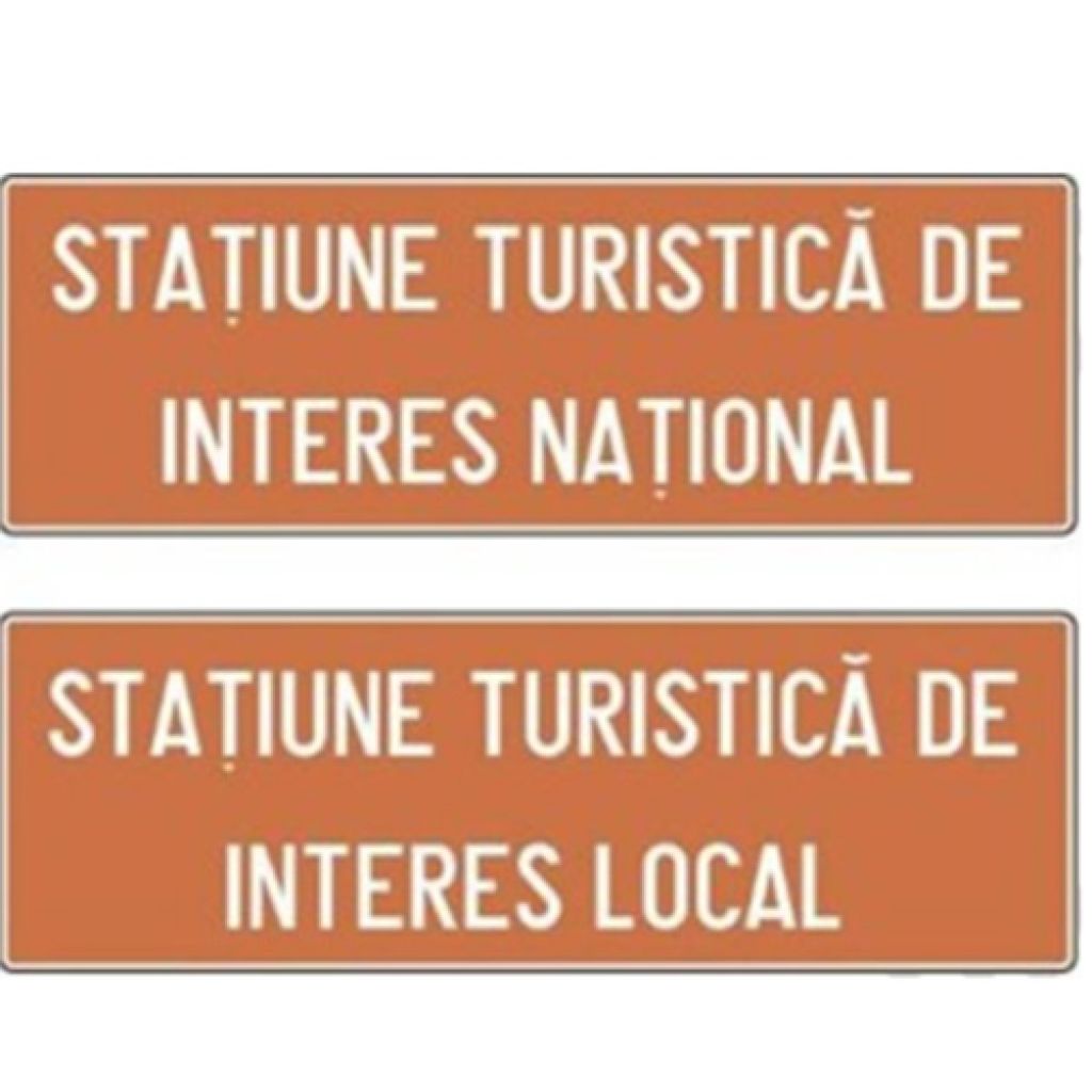 Indicator rutier de informare turistică T15 Statiune Turistica semnalizeaza si directioneaza spre o statiune turistica. Are forma dreptunghiulara, fundal maro si text/simboluri albe.. Este amplasat pentru a ghida turistii catre destinatii de interes turistic.