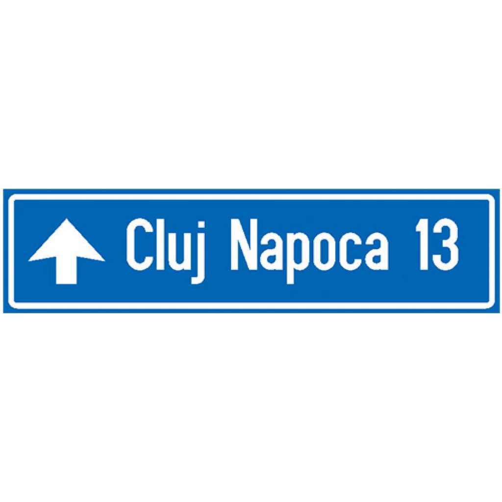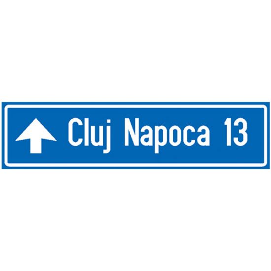Indicator rutier de orientare F11 Confirmarea directiei de mers spre o localitate si distanta pana la aceasta certificat CE, fabricat din tabla de otel tratata anticoroziv prin zincare sau fosfatare, finisat cu vopsea aplicata in camp electrostatic si acoperit cu folie reflectorizanta de clasa I, II sau III, asigurand vizibilitate si durabilitate ridicate.