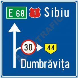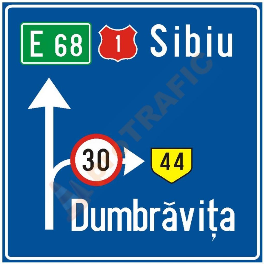 Indicator rutier obligare F1b Presemnalizarea directiilor la o intersectie de drumuri este instalat la 100-200m de o intersectie de drumuri. Acest indicator presemnalizeaza directiile de urmat pentru locatiile inscrise pe indicator.