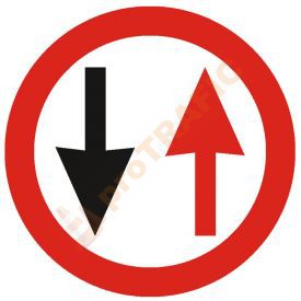 Indicator rutier prioritate B5 Prioritate pentru circulatia din sens invers se montează pe sectoarele de drum îngustat unde nu au loc să circule două vehicule unul pe lângă celălalt, fiind precedat de indicatorul "Drum îngustat". La întâlnirea acestui indicator, conducătorul autovehiculului pierde prioritatea faţă de toate autovehiculele care circulă din sens opus. Acest indicator poate fi însoţit şi de un panou adiţional pe care sunt precizate categoriile de autovehicule carora li se adresează acest indicator.