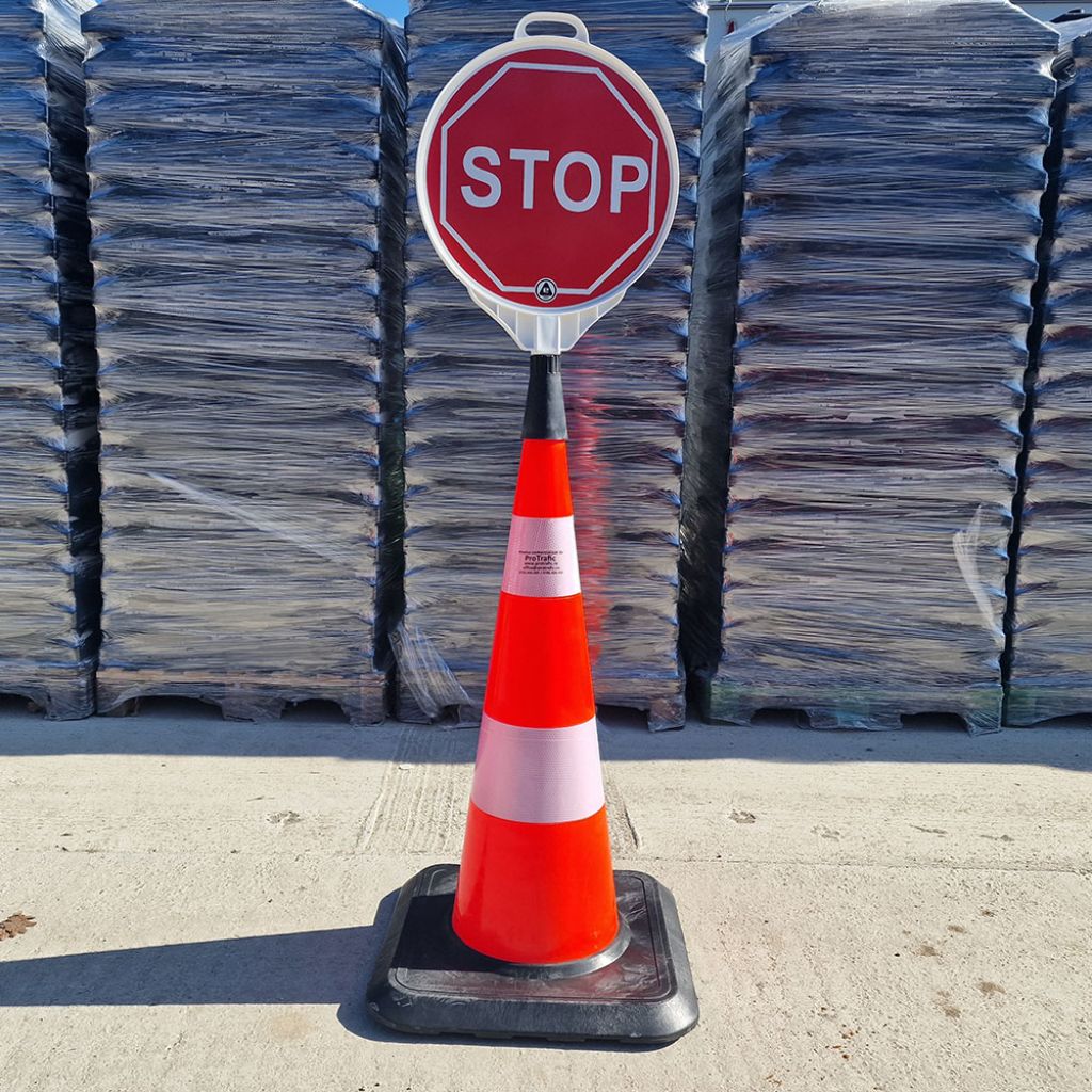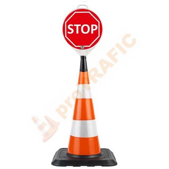Kit con 900mm cu greutate si indicator STOP sunt echipamente esentiale pentru siguranta in trafic, fabricate din cauciuc durabil.