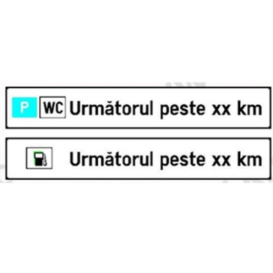 Are forma dreptunghiulara, fundal albastru si text sau simboluri albe care indica facilitatile disponibile (ex. combustibil, restaurant, parcare) si distantele relevante. Este utilizat pentru a ajuta planificarea opririlor in timpul calatoriilor pe drumuri de mare viteza.