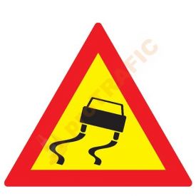 Aceste indicatoare rutiere, se întâlnesc de regulă pe sectoarele de drum pe care se execută lucrări. În acest caz, conducătorii auto sunt avertizați că urmează un sector de drum lunecos.
