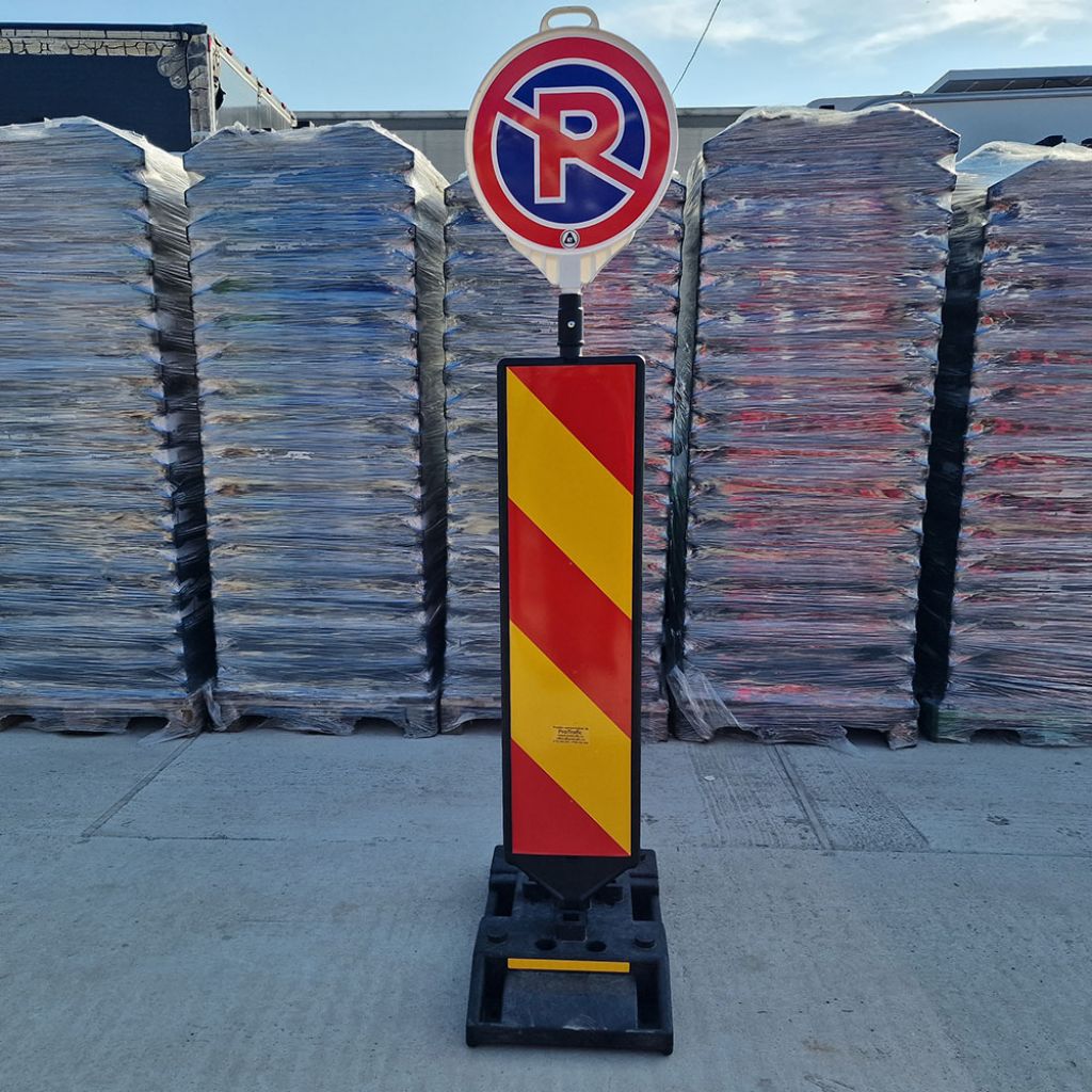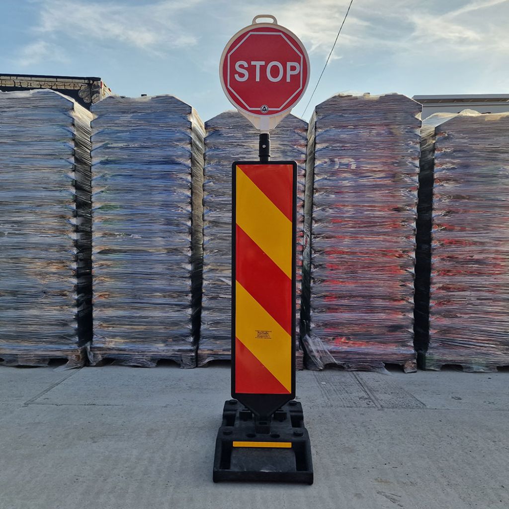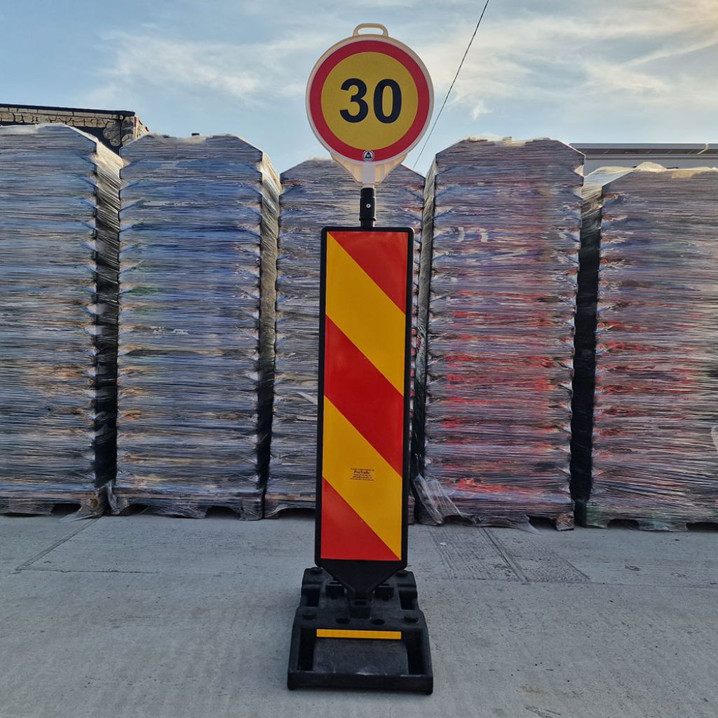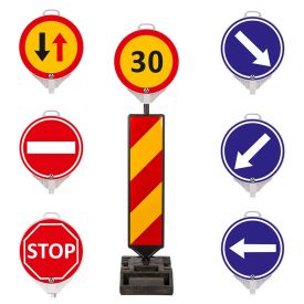 Set baliza semnalizare, folie cl 1, baza 15 kg, cu indicator rotund sunt echipate cu indicatoare rotunde cu diferite semne ce au aplicata folie reflectorizanta.