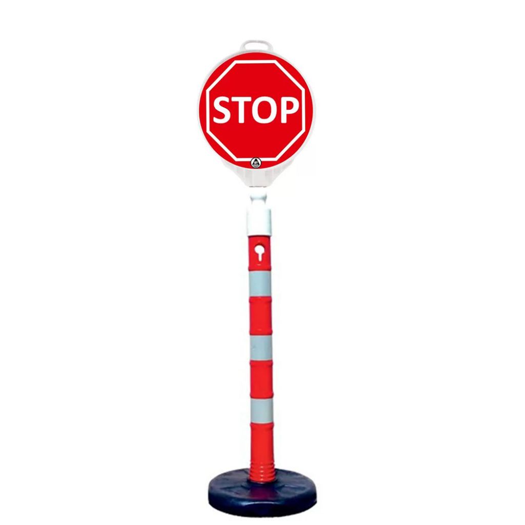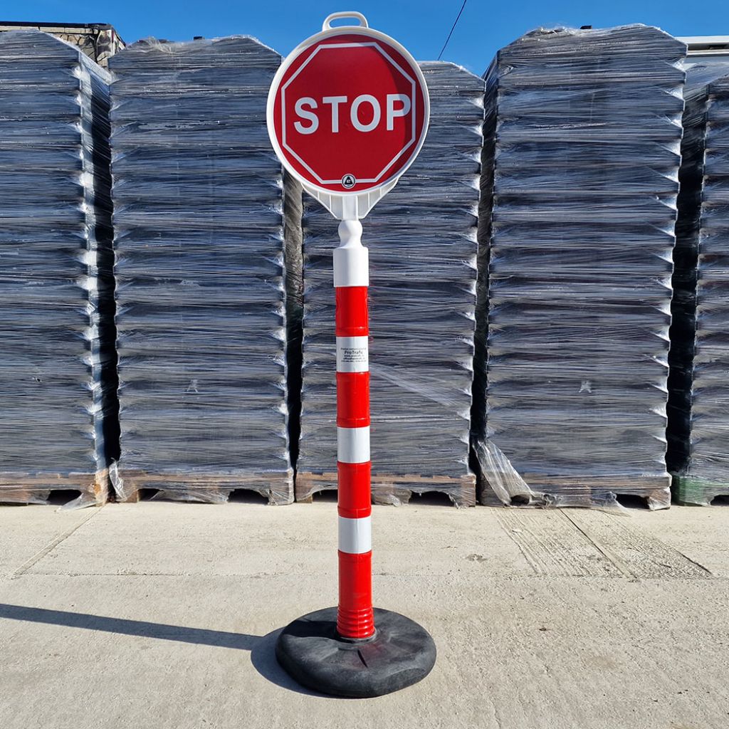 Set stalp dirijare cu indicator plastic STOP, greutate 6,5kg, 1100mm este un echipament de dirijare si semnalizare fabricat dintr-un plastic rezistent conceput pentru a rezista la uzura si conditiile atmosferice variate. Baza de cauciuc adauga greutatea necesara pentru a mentine stalpul in pozitie veritcala si pentru a impiedica rasturnarea acestuia in conditii de vant sau impact. Este utilizat la marcarea diferitelor spatii, ghidarea traficului sau pentru alte scopuri practice la interior sau exterior.