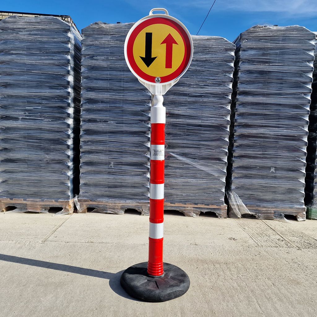 Set stalp mobil cu baza 6,5kg, 1100mm indicator Prioritate pentru circulatia din sens invers este un echipament de dirijare si semnalizare fabricat dintr-un plastic rezistent conceput pentru a rezista la uzura si conditiile atmosferice variate. Baza de cauciuc adauga greutatea necesara pentru a mentine stalpul in pozitie veritcala si pentru a impiedica rasturnarea acestuia in conditii de vant sau impact. Este utilizat la marcarea diferitelor spatii, ghidarea traficului sau pentru alte scopuri practice la interior sau exterior.