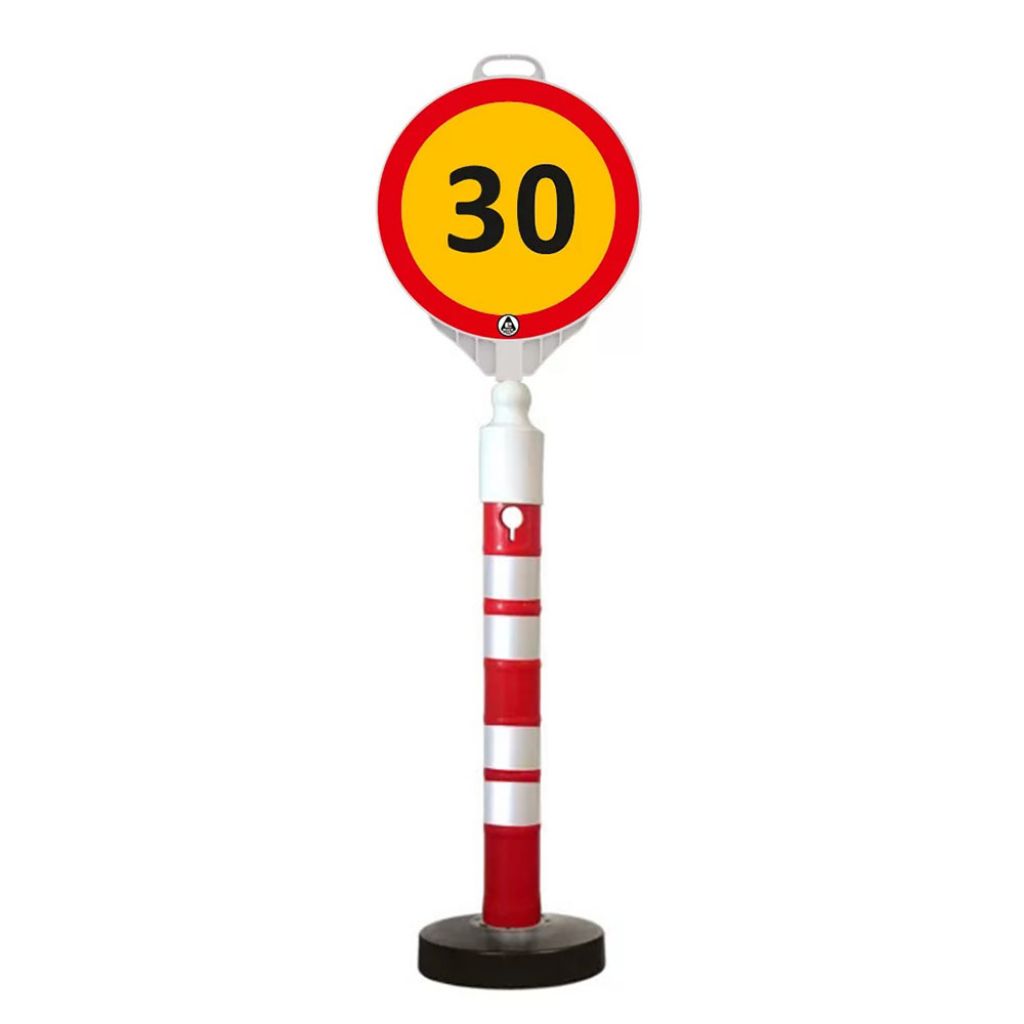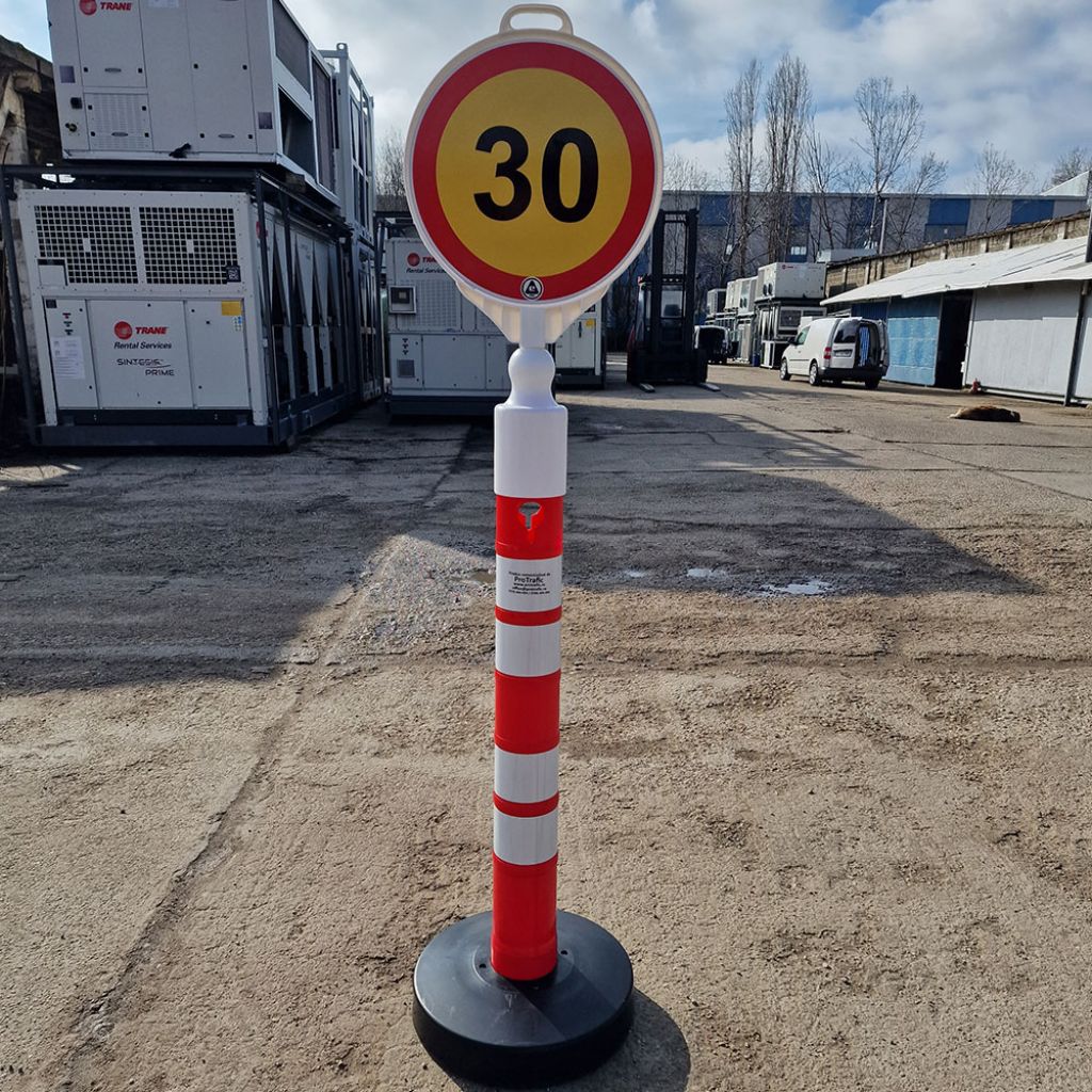 Set stalp pentru limitare viteza 30km/h, greutate 12 kg, inaltime 1200mm cu baza de plastic umpluta cu nisip si o greutate de 12 kg, este un dispozitiv mobil si stabil, ideal pentru marcarea diferitelor spatii sau ghidarea traficului in diverse contexte. Acesta este confectionat din plastic durabil, este usor de manevrat si rezistent la conditii atmosferice variate.