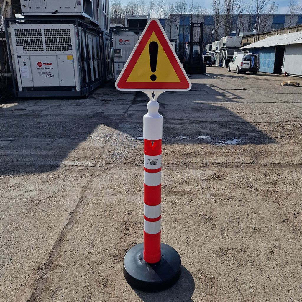 Stalp atentionare mobil 1200mm, 12kg cu indicator Atentie cu baza de plastic umpluta cu nisip si o greutate de 12 kg, este un dispozitiv mobil si stabil, ideal pentru marcarea diferitelor spatii sau ghidarea traficului in diverse contexte. Acesta este confectionat din plastic durabil, este usor de manevrat si rezistent la conditii atmosferice variate.