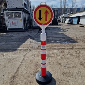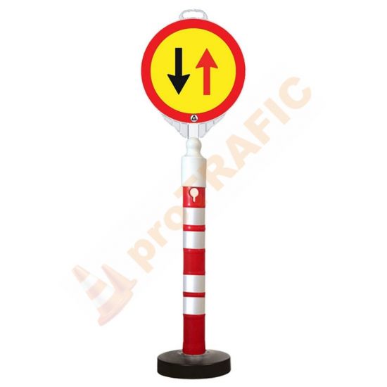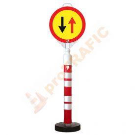 Stalp atentionare mobil 1200mm, 12kg cu indicator Prioritate pentru circulatia din sens invers cu baza de plastic umpluta cu nisip si o greutate de 12 kg, este un dispozitiv mobil si stabil, ideal pentru marcarea diferitelor spatii sau ghidarea traficului in diverse contexte. Acesta este confectionat din plastic durabil, este usor de manevrat si rezistent la conditii atmosferice variate.